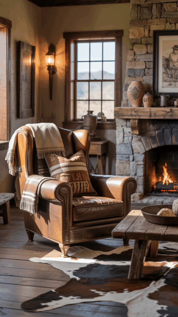 Cowhide rugs are iconic in cowboy decor. Use them under a coffee table or beside a reading chair for a soft, rustic layer. Curtains in burlap, linen, or raw cotton add privacy without overwhelming the space.