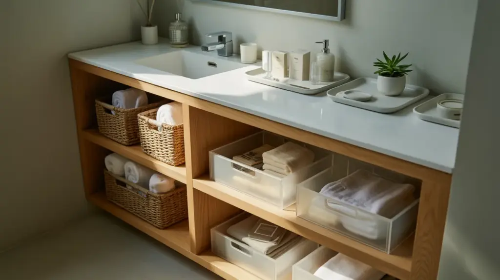 Start by clearing everything off your vanity, shelves, and floor. Assess what you actually use daily, weekly, or occasionally. Store items in appropriate zones using containers or hidden cabinets. Limit how many products are on display to maintain a streamlined look.