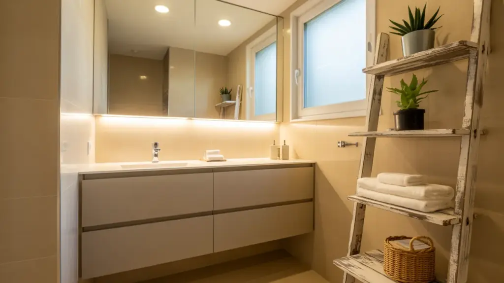 Wall-mounted sink consoles with towel bars or floating vanities with under-storage baskets can save floor space and offer a modern, streamlined aesthetic. Even a compact ladder shelf can offer storage, display, and towel-hanging space in one.